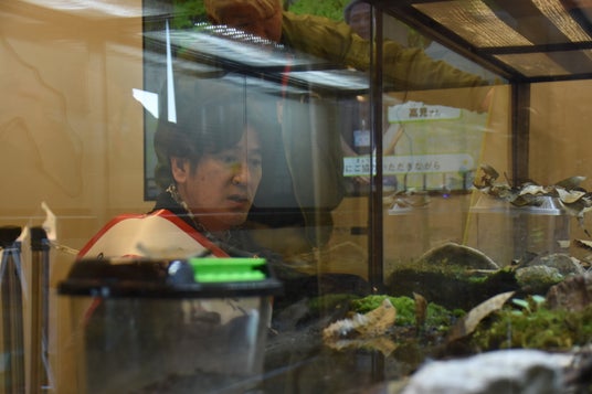 トークショーで話題に出たヤマトサンショウウオを観察する田中さん