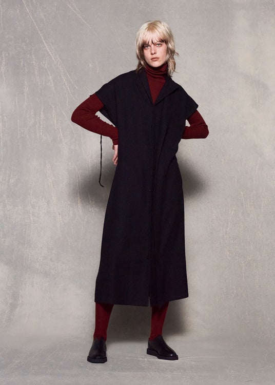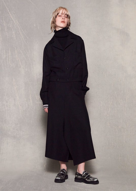 ウール素材のフレンチスリーブドレス。片側だけ二重になった裾のディテール、左右非対称の襟。インナーや、色物のタイツを合わせたレイヤードを提案。