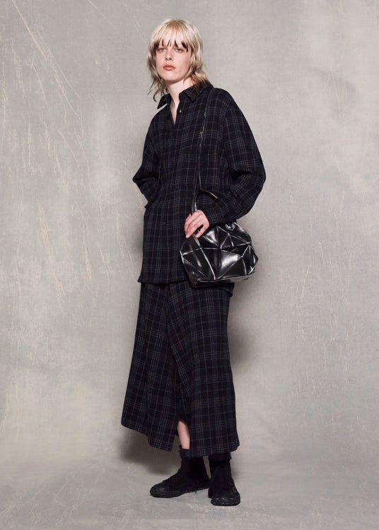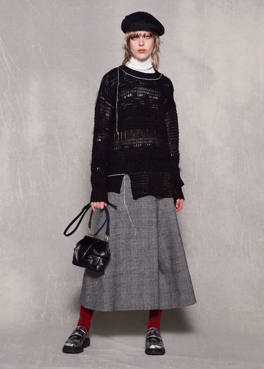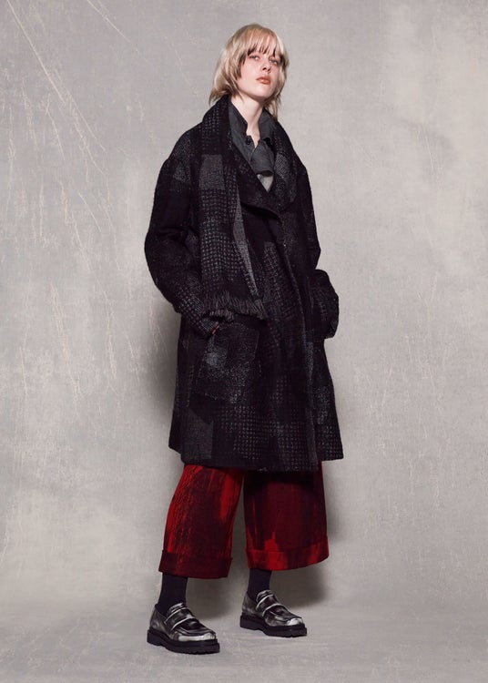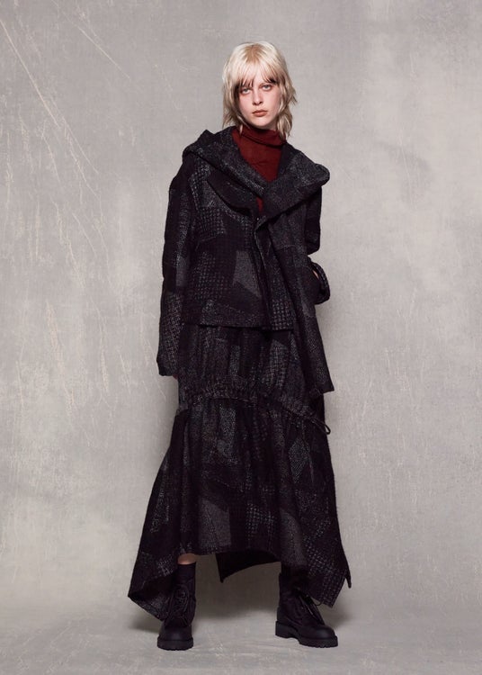 ヘリンボンとチェック柄のパッチワークをニードルパンチで表現したような表情を持つジャカード織の生地。複雑なイメージを加工や技術の掛け合わせで具現させた。ストールが付いたジャケット、ギャザーがデザインされたスカートが、複雑さをスタイルに落とす。