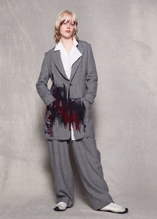 重心の下がったバランスが特徴のジャケットと、ワイドシルエットのスラックス。軽やかなボリュームとウォーム感のある千鳥格子のウール。服に直接ペイントされたように勢いよく配された、女性モチーフが隠れた抽象画柄。古着のプルオーバーシャツを着想源に、前開きに調整された白シャツ。