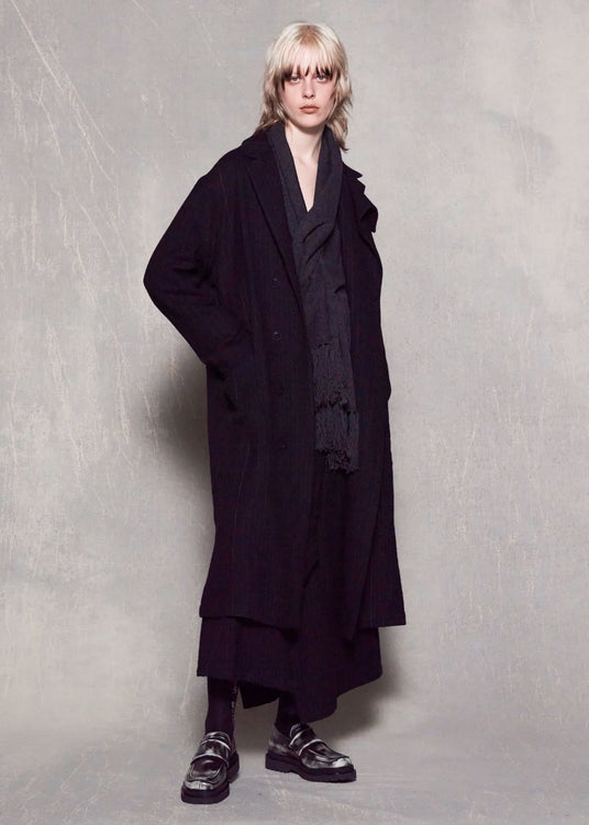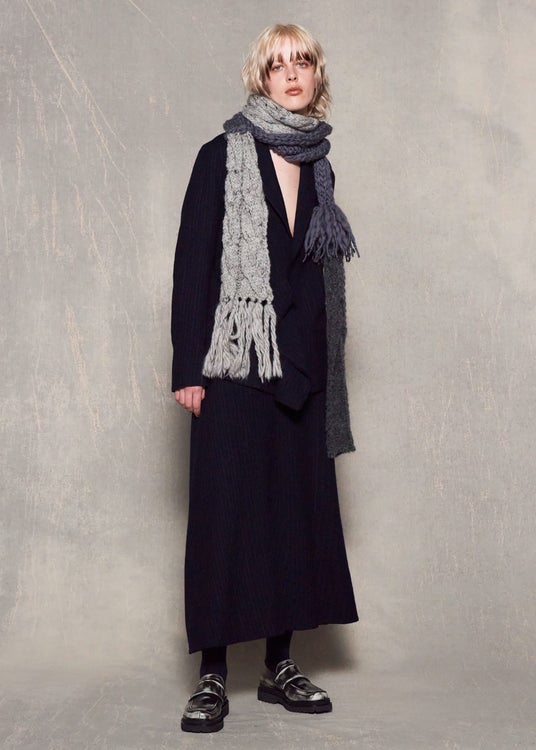 造作で生まれるドレープをデザインしたジャケット。不規則な造形のスカート。細番手の糸をざっくり織り上げ縮絨加工された風合いが、柔らかくウォーム感のあるウール生地。ボリュームのあるティピカルな印象も心地よいマフラー。