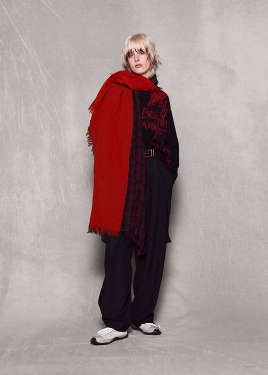 ニードルパンチのような風合いのジャカード織のコート。襟元に造作のできるデニムシャツ、赤の落書き柄のパンツ、ペイントしたようなシューズ。複雑な表情をまとめたスタイル。