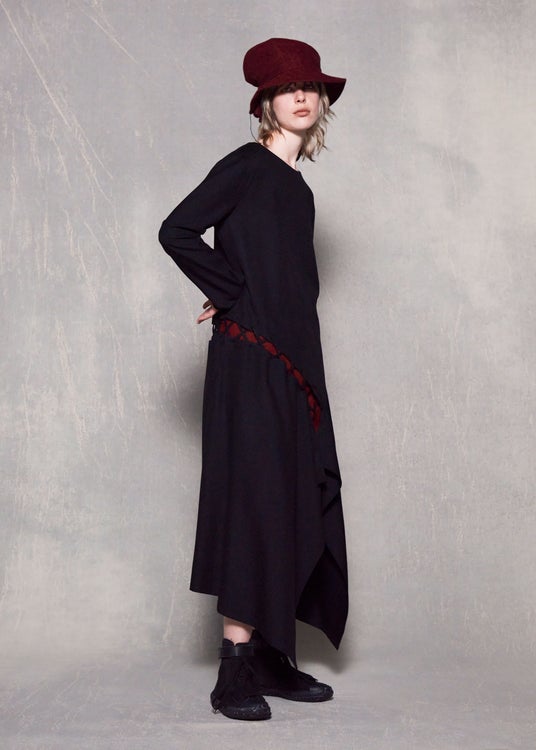 ウールレーヨンで仕立てられたレースアップディテールの入ったドレスシルエット。レースアップから覗く深い赤のパンツ。ユニークなフォルムの帽子。