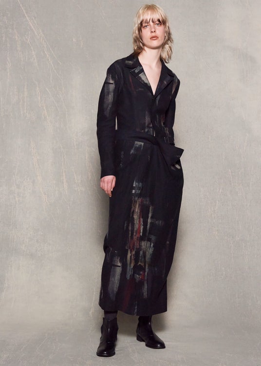 麻綿素材のデニム生地。シャツの様に肌に直接着る軽い仕立てのジャケットと、ウエストで布が部分的に落ちたスカート。同柄・同素材の組合せが、直線的なラインと、布の動きで生まれるフォルムを際立たせる。ローラーペイントのような柄。