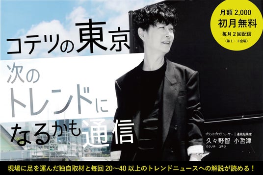 ブランドプロデューサーとして数多くの事業を成功に導いてきた久々野智小哲津(ククノチ コテツ)が、トレンドの種からビジネスアイディアのヒントをつかむ定期発行マガジン『東京、次のトレンドになるかも通信』を12/20(金)19時から本格始動します。