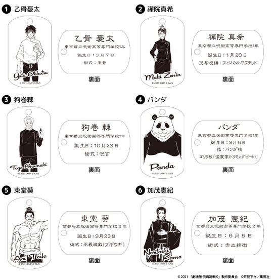 ドッグタグの裏面は選択したキャラクターのプロフィールが刻印。キャラクターの名前はもちろん、学校名、誕生日、術式など、ファンにはたまらない仕様となります(一部、名前のみのキャラクターもあり。裏面は「刻印なし」も選べます)。