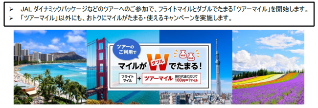 JALは、今後のさらなる観光需要喚起を目的に、「JALダイナミックパッケージ」などのジャルパックの対象商品をご利用いただくことで旅行代金に応じて100円につき1マイルを提供するサービス「ツアーマイル」を開始します。従来の「フライトマイル」(*1)に加えて「ツアーマイル」がダブルでたまるサービスとなり、今まで以上におトクにご旅行をお楽しみいただけます。また、「ツアーマイル」以外にも、区間マイルが100%たまる「JALカードツアープレミアム」(*2)へ登録すると、年会費相当分のe JALポイントがプレゼントされるキャンペーンやたまったマイルを利用しツアー商品をおトクに購入できるキャンペーンなども実施します。