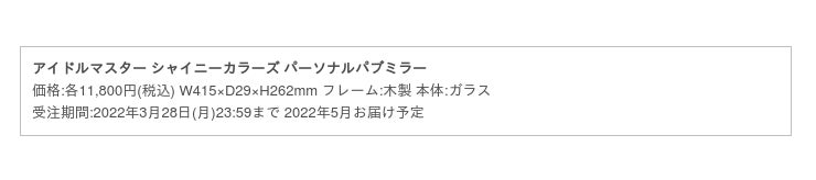 株式会社バンダイナムコアミューズメントは「アイドルマスター シャイニーカラーズ パーソナルパブミラー」、『大崎甘奈(おおさき あまな)』・『大崎甜花(おおさき てんか)』・『桑山千雪(くわやま ちゆき)』を3月10日(木)に発売します。3人は「アイドルマスター シャイニーカラーズ」に登場するアイドルユニット、『アルストロメリア』のメンバー。同日より株式会社バンダイナムコエンターテインメントが運営するECサイト、「アソビストア」にて期間限定の受注販売を行います。