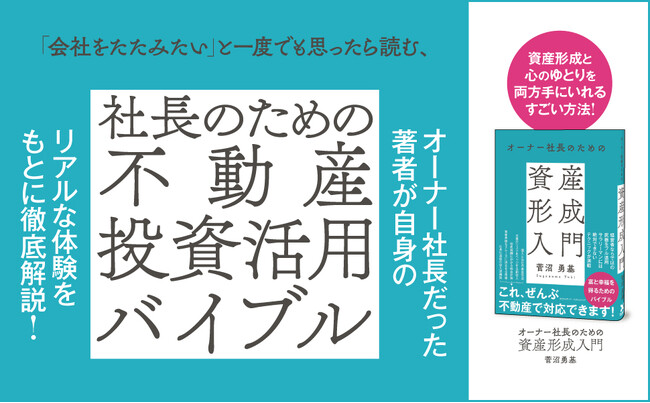 執筆したのは、神奈川県を中心に不動産投資のサポートを一気通貫で行う、横濱コーポレーション株式会社代表取締役の菅沼勇基氏。著者自身も元々はオーナー社長で、会社を株式譲渡した経験を持っています。そのときに、不動産を所有していたことが「心のゆとり」につながり、選択肢の幅も広がったことを実感したとのこと。本書には、そうしたオーナー社長としての著者の苦悩や悩みもコラムに収録しています。