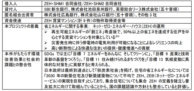 株式会社SBI新生銀行(東京都都中央区、代表取締役社長:川島 克哉、以下「SBI新生銀行」)は、東西アセット・マネジメント株式会社(東京都港区、代表取締役社長 平澤 順、以下「東西アセット・マネジメント」)がアセットマネージャーを務めるZEH※1(ゼッチ、Net Zero Energy House)の認証を受けた賃貸マンションの運用を目的とした合同会社2社(以下、「本ファンド」)に向け、2023年7月31日付で「新生グリーンローン」※2としてシニアローン50.7億円を実行いたしました。ZEH賃貸マンションを運用するファンドへのグリーンローンの実行は、SBI新生銀行としては初の取り組みとなります。