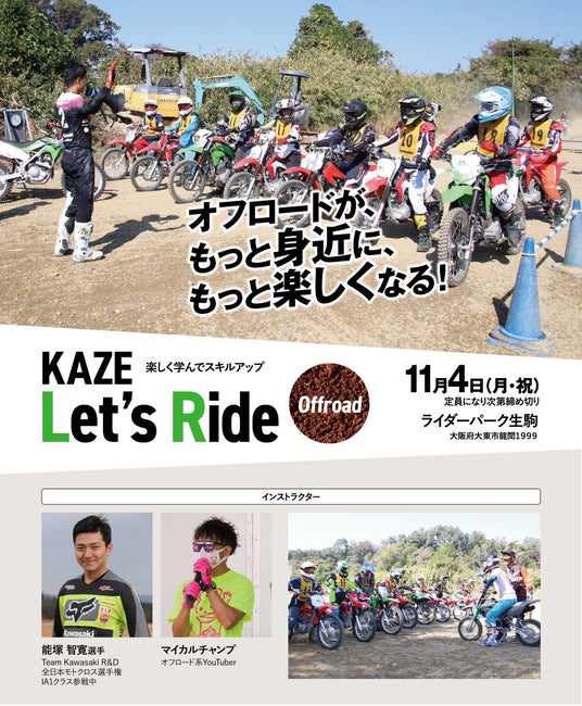 株式会社カワサキモータースジャパン(本社:兵庫県明石市、代表取締役社長:佐伯 健児)は、2024年11月4日(月・祝)にライダーパーク生駒で行われる「KAZE Let’s Ride オフロード」についてお知らせいたします。