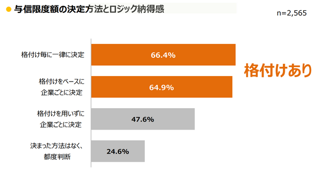 与信限度額の決定方法として自社格付けを用いている企業は、与信限度額設定ロジックの納得感が高くなっています。『格付け毎に一律に決定』もしくは『格付けをベースに企業ごとに決定』のいずれも約3社に2社は与信限度額の設定ロジックとして納得感を感じています。