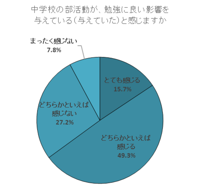 中学校の部活動が、勉強に良い影響を与えている・与えていたと感じるかを聞いたところ、「とても感じる」が15.7%、「どちらかといえば感じる」が49.3%となり、約3分の2の保護者が「中学校の部活動が子どもの勉強にプラスだ」と感じていることが明らかとなった。