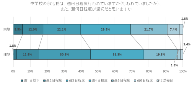 中学校の部活動の活動日数の実態と、理想の活動日数について保護者に聞いた。