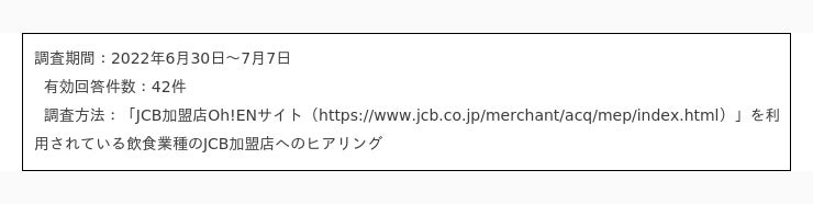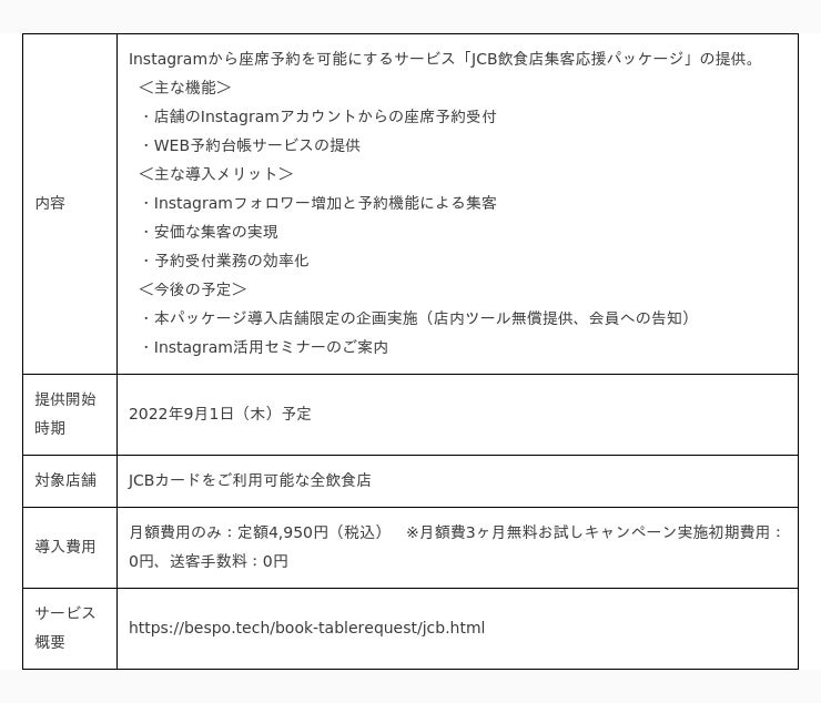株式会社ジェーシービー (本社:東京都港区、代表取締役会長兼執行役員社長:浜川 一郎、以下:JCB)は、株式会社Bespo(本社:東京都港区、代表取締役社長:高岳 史典、以下:Bespo)と、JCB加盟店向けに、飲食店の集客に関する課題解決を目的とした「JCB飲食店集客応援パッケージ」を2022年9月1日(木)より提供予定です。