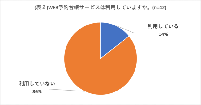 JCBの調査では、予約方法で最も利用されている方法(表1)は「WEBからの予約」が12%、WEB 予約台帳サービスの利用有無(表2)では14%の利用に留まるという結果でした。