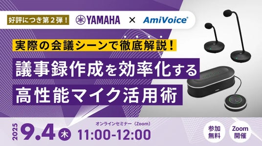 2025年9月4日(木)、株式会社アドバンスト・メディア(本社:東京都豊島区、代表取締役会長兼社長:鈴木清幸 以下、アドバンスト・メディア)は、オンラインセミナー「実際の会議シーンで徹底解説!議事録作成を効率化する高性能マイク活用術【ヤマハコラボウェビナー第二弾】」を開催いたします。