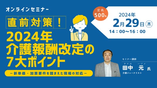 法律関連出版物、各種データベースを提供する第一法規株式会社(所在地:東京都港区、代表取締役社長:田中 英弥)は、オンラインセミナー「直前対策!2024年介護報酬改定の7大ポイント-新単価・加算要件を踏まえた現場の対応-」を、2024年2月29日に開催します。