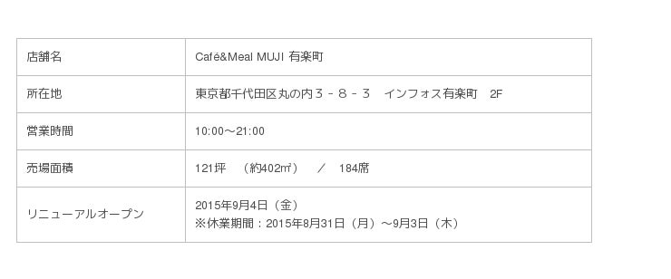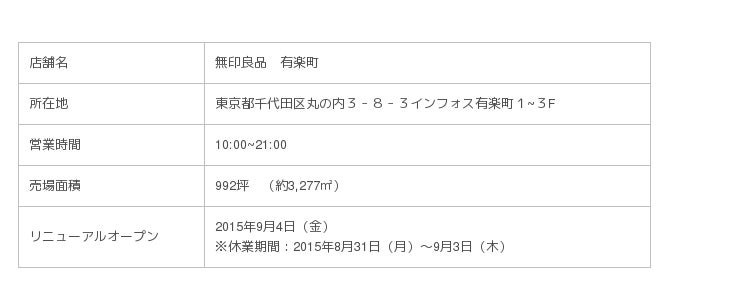 無印良品を展開する株式会社良品計画(東京都豊島区/代表取締役社長 松崎曉)は、無印良品有楽町(東京都千代田区)の1~3階の全フロアをリニューアルし、9月4日(木)にオープンいたします。無印良品有楽町は、2001年11月の開店以来、世界最大の売場面積を誇る旗艦店として多くのお客様に愛されてきましたが、国内外の無印良品店舗最大の品揃えと最新のサービスを導入し、お客様との双方向でのコミュニケーションをさらに強化します。世界26の国と地域に723店舗(2015年6月末現在)を展開する無印良品最大の旗艦店として、これまで各地域のお客様に提案してきた商品やサービスを一堂に会し、無印良品の‘今’を伝えてまいります。