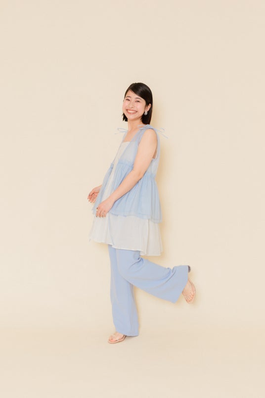 永田さんは、なで肩さんだったのでそれがあまり気にならないようにキャミソールとベストのレイヤードにしました。永田さんはキレイめ好きでしたのでシースルー素材と水色と白の配色で涼しげでクールだけどフェミニンな印象に。1番新しいジャンルの扉が開いた気がします。