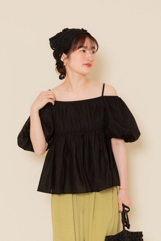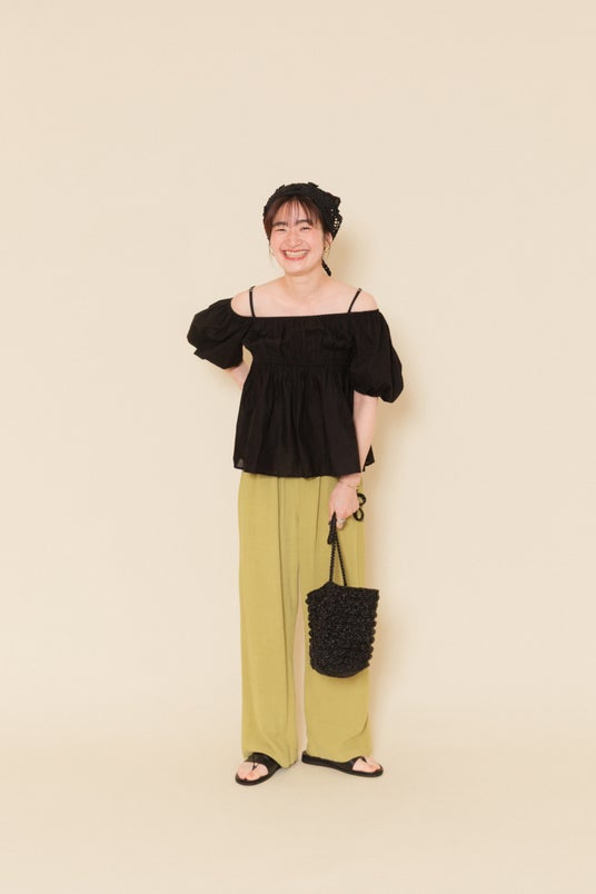 スタイリスト渡邉恵子首のデコルテが美しかったのでデコルテ部分を強調できるトップスを!と思いオフショルトップスを選びました。