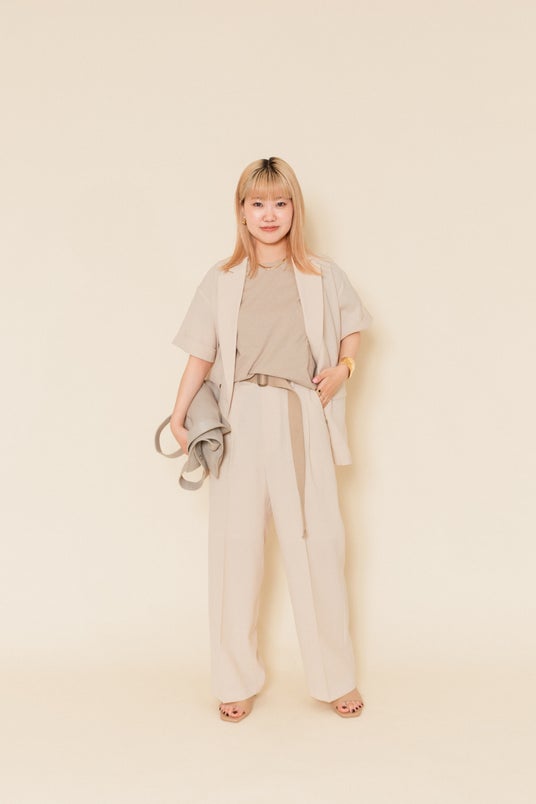 上半身を着痩せしたいとおっしゃっていたので、ジャケットのインナーも抜けが出るようにヌーディカラーのTシャツをあわせました。ジャケット自体のデザインがかっちりとした印象になりやすいので、ヌーディカラーで統一すると抜け感がでます。相沢さんはトラッドとモードがお好きなので、ジャケットのトラッドにあえてクールめなデザインのゴールドのジュエリーを散らして。相沢さんのキレイなゴールドヘアーともマッチしていました。