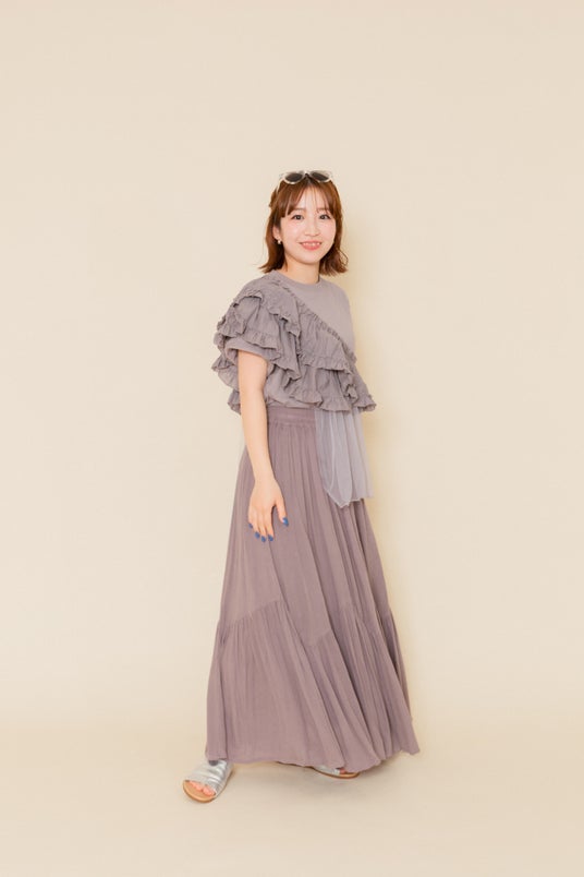 下半身に悩みがある人の着痩せということで、ボトムはパンツよりも広がりすぎてないスカートでなおかつ落ち感があって細かいギャザーやプリーツなど縦のラインがさりげなくあるものを選ぶと下半身が華奢に見えます。身体のラインを拾わないIラインスカートなどもオススメ。今回はフリルが大胆にあるTシャツなので、ついついデニムやパンツも可愛いくてあわせたいですが、Tシャツと色味を揃えてワンピース風にしてみました。倉持さんは甘辛ミックスがお好きなので、今回はサングラス小物とグレーのワントーンで辛口要素を。