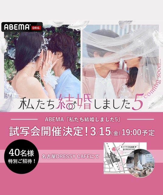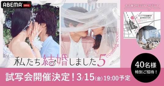 2024年3月15日(金)「ABEMA」オリジナル恋愛番組『私たち結婚しました 5』の放送直前先行試写会を、KITTE名古屋3F「DRESSY CAFE」にて実施決定。