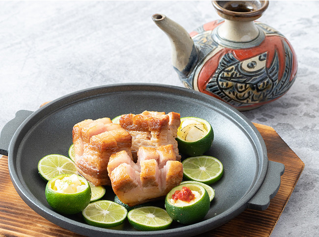 香ばしく焼き上げたチャーグー豚を、恩納村の山奥で育ったシークヮーサー、泡盛とともに蒸し焼きにしました。爽やかなシークヮーサーの香りとともにチャーグー豚を、3種バター(シークヮーサー、島唐辛子、島ニンニク)でお楽しみください。