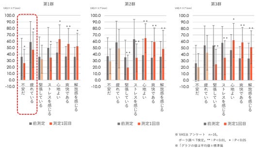 また、全ての群で「ストレスを感じる」は低下し、「心地よい」「爽快である」 「解放感を感じる」は増加する結果となりました。