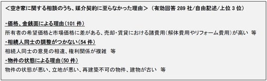 空き家に関する相談から媒介契約に至らなかった理由は、「価格、金銭面による理由」が最多。その他、「相続人同士の調整がつかない」、「物件の状態による理由」など、さまざまな要因が挙げられました。
