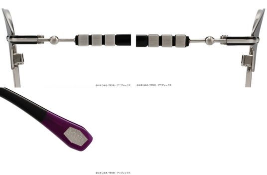 ネイビー×シルバーの配色のメガネは、掛けるとリョウのようなクールな印象に。泣きぼくろやヘアピンなどメガネ全体でリョウらしさを表現。