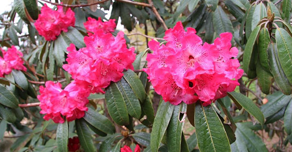 ヒマラヤのシャクナゲ「ロードデンドロン・アルボレウム」は、日本のシャクナゲよりも2週間ほど早く開花し、ルビーのような紅色の花は、咲き始めると園内にとても華やかな景観を作り出します。当園では、現在見ごろを迎えており、今月末までお楽しみいただける見込みです。