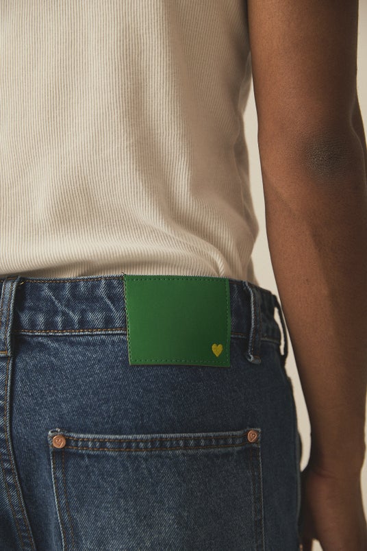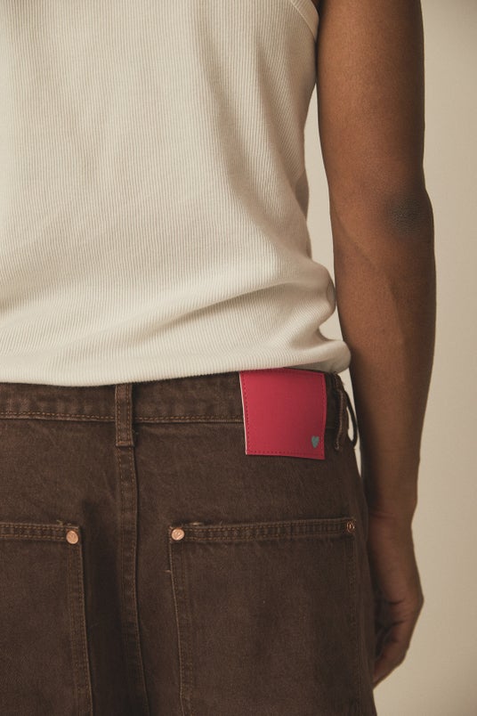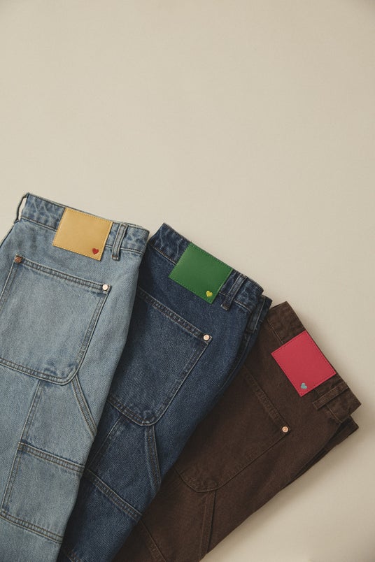 フロントボタンにはブランドを象徴する蜂のモチーフを、各リベットにはハートマークを刻印しています。また、背面のレザーパッチは、デニムパンツの色味に合わせてそれぞれ別のカラーが選定されており、ワンポイントでハートマークの刺繍が施されています。