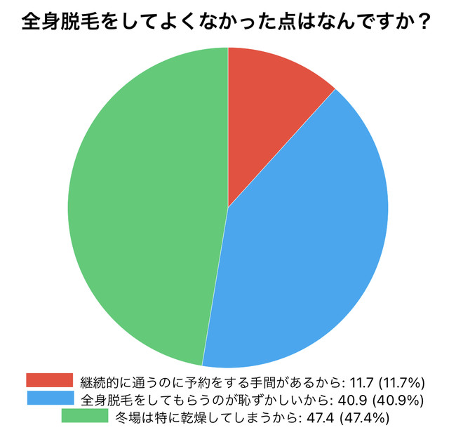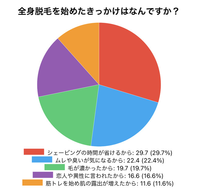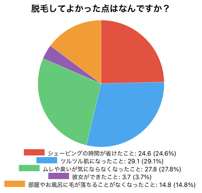 メリットの点では、”全身脱毛を始めてからシェービングの時間が省ける”というメリットだけでなく”異性からの印象も良くなる”と言った回答が多いことがわかりました。