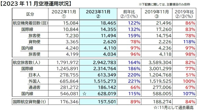 ●国内線旅客数は、11月として過去最高の62.8万人(前年同月比115%、2019年同月比107%)となりました。