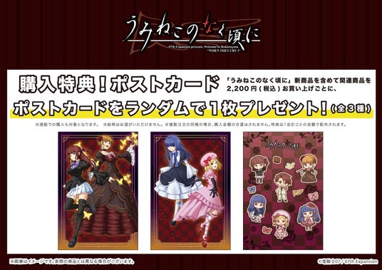 今回発売した『うみねこのなく頃に』の新作グッズを含む関連商品を、1会計で2,200円(税込)お買い上げごとに、ポストカード(全3種)をランダムで1枚プレゼント!