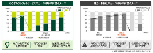 ひろぎんクレジットサービスが提供するコーポレートカード、パーチェシングカードは、締日翌日に利用枠がクリアされるため、ひと月単位での利用枠設定・与実管理が簡単になります。