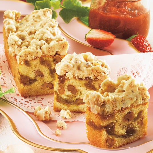 ルバーブとストロベリーの自家製ジャムとくるみを加えて焼き上げた生地の上に、ヘーゼルナッツ味のクランブル(そぼろ状のクッキー)をのせました。ジャムの甘酸っぱさがクセになるしっとりとした生地と、くるみとクランブルのザクザクとした食感が楽しめる贅沢なケーキです。
