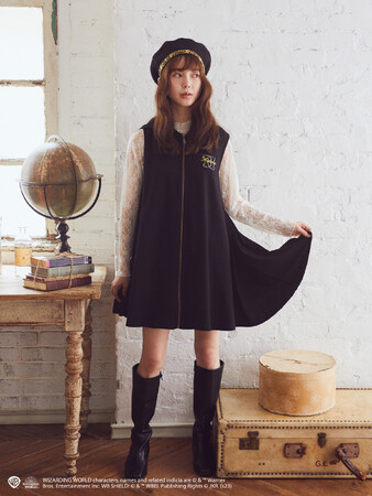 中でも一押しは、ホグワーツ魔法魔術学校の制服をイメージしたマントジレとベレー帽です。ホグワーツに通う生徒たちが着用しているローブを、ジレに落とし込みました。胸元にあしらったホグワーツのロゴプリントもポイントです。ファスナーの開閉で着回しが楽しめ、羽織としてはもちろん、ワンピースとしても着用いただけるこだわりのデザインです。