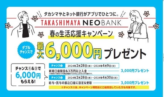 住信SBIネット銀行株式会社(本社:東京都港区、代表取締役社長(CEO):円山 法昭、以下「住信SBIネット銀行」)と株式会社高島屋(本社:大阪市中央区、代表取締役社長:村田 善郎、以下「高島屋」)は、より多くのお客様に高島屋ネオバンクのご利用いただくために「高島屋ネオバンク 春の生活応援キャンペーン ダブルチャンスで最大6,000円プレゼント」を2024年2月28(水)から実施します。