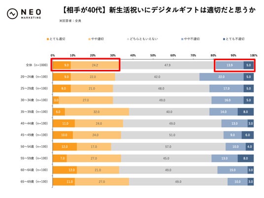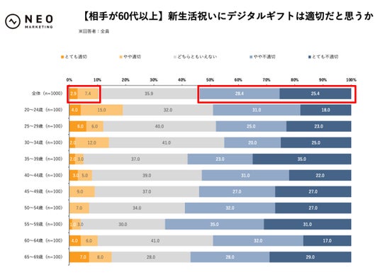 新生活祝いを贈る場合、デジタルギフトは適切だと思うかを、贈る相手の年代別でお聞きしました。