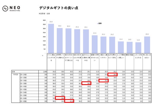 例えば20~24歳では「住所を聞かなくて済む」28.0%、30~34歳では「少額から贈りやすい」25.0%、35~39歳では「遠方の人にも簡単に贈れる」36.0%と高めでした。