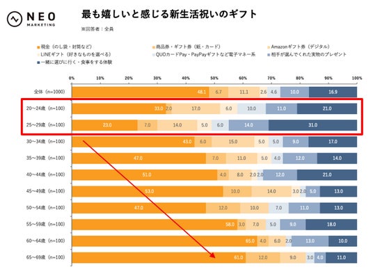 特に20~24歳では「現金」26.0%が最多ながら、「Amazonギフト券(デジタル)」19.0%、「QUOカードPay・PayPayギフトなど電子マネー系」15.0%、「実物の商品・プレゼント」14.0%、「商品券・ギフト券」13.0%、「LINEギフト」13.0%、「食事・体験ギフト」12.0%と幅広く並び、特定の一形式に偏っていません。