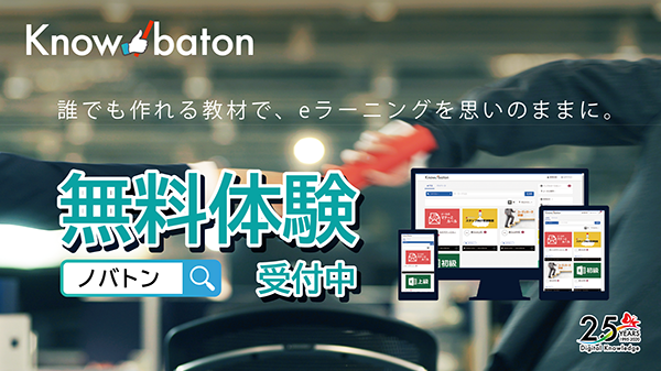 『Know-baton(ノバトン)』は、教材・マニュアルをかんたん作成してオンラインで配信、理解度チェックシートで研修成果を確認・評価する新しいeラーニングサービスです。社内の知識、業務ノウハウ、知見を確実にバトンして、強い組織作りを実現します。
