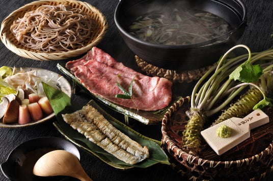 本料理では、鰻と山葵とともに、レタスを中心とした高原野菜も一緒に味わいます。標高が高く、昼夜の寒暖差も激しい環境で育ったレタスは水分量も多くジューシーで、甘みと旨味があわさり、鍋との相性も抜群です。そして、白鍋を楽しんだ後は信州名産の蕎麦(*1)で締めを楽しみます。香り高く、風味豊かな蕎麦のため、鰻の脂がしみた旨味とともに、蕎麦本来の華やかな香りを感じることができます。鍋の最初から最後まで、長野の清らかな水で育まれた食材を堪能できる一品です。