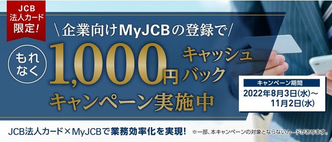 株式会社ジェーシービー (本社:東京都港区、代表取締役会長兼執行役員社長:浜川 一郎、以下:JCB)は、2022年8月3日(水)から11月2日(水)の期間中、JCB法人カード会員様(JCB CARD Bizは除く)を対象に、「法人カード限定!企業向けMyJCB新規登録でもれなく1,000円キャッシュバックキャンペーン」を実施します。