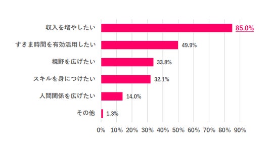 スポットワークをしたいと感じる理由は「収入を増やしたい」85.0%が圧倒的に多く、2位「すきま時間を有効活用したい」49.9%でした。
