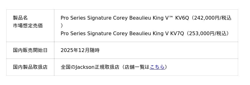 フェンダー ミュージカル インストゥルメンツ コーポレーション(所在地:米国 カリフォルニア、CEO アンディ・ムーニー、以下FMIC)は、ハイパフォーマンスエレキギター/ベースブランドのJackson(R)︎よりTriviumの卓越したギタリスト、コリィ・ビューリューのシグネイチャーシリーズの最新モデル『Pro Series Signature Corey Beaulieu King V KV6Q / KV7Q』(2機種)を発表し、日本での販売を開始しました。