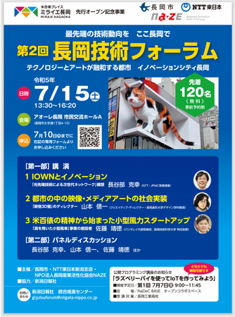 長岡市(市長:磯田 達伸)、東日本電信電話株式会社新潟支店(新潟支店長:徳山 隆太郎 以下、NTT東日本)、NPO法人長岡産業活性化協会NAZE(会長:大井 尚敏)では、2023年7月15日(土)に第2回長岡技術フォーラムを開催いたします。